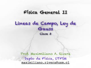 El documento presenta conceptos sobre líneas de campo eléctrico y flujo de campo vectorial. Define línea de campo eléctrico como una línea tangente al vector campo eléctrico en cada punto. Explica que el flujo de campo a través de una superficie se define como la integral del producto punto del campo y la superficie elemental a lo largo de toda la superficie.