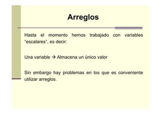 El documento trata sobre los fundamentos de programación centrados en arreglos, incluyendo vectores y matrices, y su implementación en VBA. Se explican distintos tipos de arreglos, cómo se declaran y se les asignan valores, así como ejercicios prácticos para ilustrar su uso. También se aborda la definición de tipos de datos definidos por el usuario en VBA.