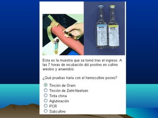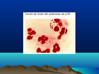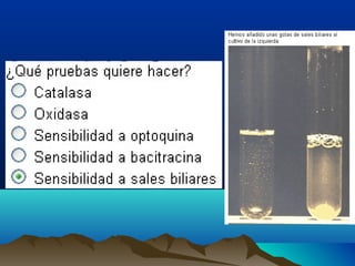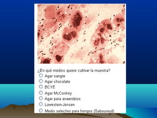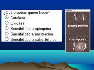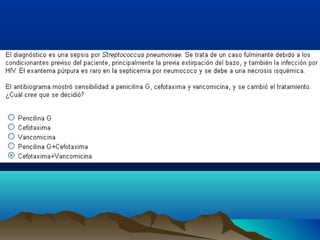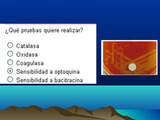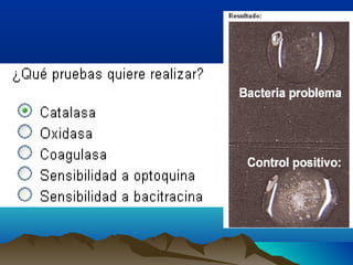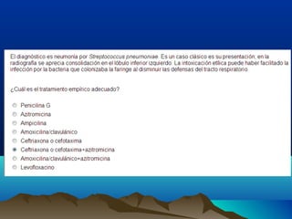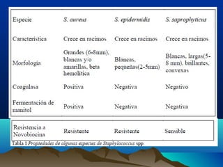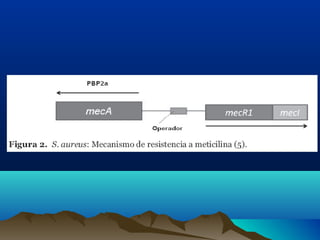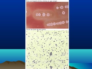 Este documento describe las características de Staphylococcus aureus y Streptococcus pneumoniae. S. aureus es un coco gram positivo que puede causar infecciones cutáneas y sistémicas graves debido a factores de virulencia como toxinas y resistencia a antibióticos. S. pneumoniae es un patógeno respiratorio que causa neumonía y puede diseminarse causando meningitis u otras infecciones. Ambos microorganismos son tratados con antibióticos como penicilina, aunque S. aureus ha desarrollado resistencia a betalactá