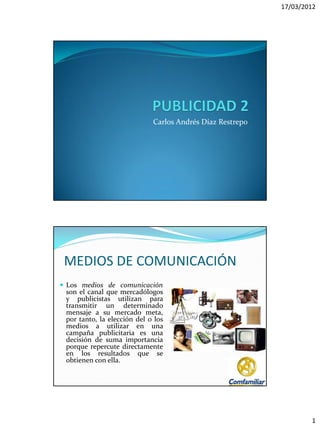 Este documento clasifica los medios de comunicación en tres tipos: medios masivos como la televisión y la radio que afectan a un gran número de personas; medios auxiliares como la publicidad exterior e interior que afectan a menos personas; y medios alternativos como faxes, carritos de compras con video y protectores de pantalla que son formas innovadoras de promoción. Proporciona ejemplos específicos de cada tipo de medio.