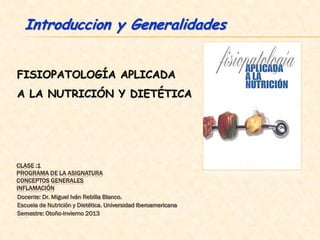 Este documento presenta conceptos generales sobre fisiopatología aplicada a la nutrición y dietética. Define salud, proceso salud-enfermedad, patología e introduce los conceptos de inflamación, incluyendo sus características, etapas, mediadores y tipos. Explica adaptaciones celulares como hiperplasia, hipertrofia, atrofia y metaplasia, así como tipos de muerte celular.