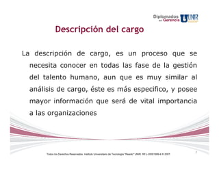 Este documento describe los elementos clave de las descripciones de cargos. Explica que una descripción de cargo identifica el cargo y a quién reporta, establece el propósito general, las finalidades, la naturaleza y alcance, y las dimensiones del cargo. Además, destaca la importancia de las descripciones de cargo para el desarrollo organizacional, la planificación de recursos humanos, el entrenamiento, la evaluación del desempeño y la administración de sueldos y salarios. Finalmente, incluye un ejemplo de descripción