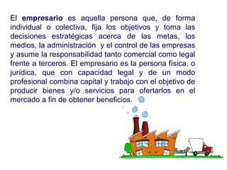 El documento trata sobre el concepto de emprendimiento. Define al empresario y emprendedor, y explica que el espíritu emprendedor se caracteriza por la innovación y la creatividad para aprovechar oportunidades. También describe diferentes tipos de emprendimiento como el interno en empresas, el privado tradicional, el académico y el social. Finalmente, analiza tendencias del mercado colombiano y la importancia de apoyar el emprendimiento desde edades tempranas.