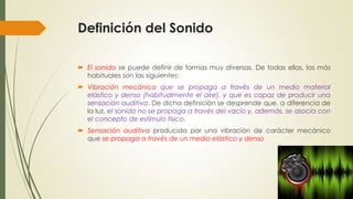 El documento proporciona una introducción a conceptos básicos de acústica. Define el sonido como una vibración mecánica que se propaga a través de un medio elástico y denso, como el aire. Explica que el sonido se genera cuando una fuente, como un tambor o cuerdas vocales, entra en vibración, transmitiendo la perturbación a las partículas de aire adyacentes. También cubre temas como la propagación del sonido, espectros frecuenciales, tipos de sonidos, velocidad del son