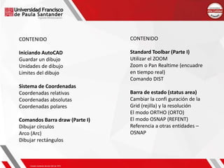 Este documento presenta un curso de AutoCAD 2D. Explica cómo iniciar AutoCAD, guardar dibujos, establecer unidades y límites de dibujo, y usar el sistema de coordenadas. También cubre comandos básicos como dibujar círculos, arcos, rectángulos y líneas, y cómo usar las herramientas de zoom y distancia.