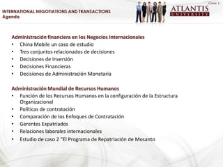 El documento presenta la agenda de una clase sobre administración financiera y recursos humanos en negocios internacionales. La clase incluye una discusión sobre China Mobile como estudio de caso, las tres categorías principales de decisiones financieras, y conceptos clave de recursos humanos como políticas de contratación, gerentes expatriados y relaciones laborales internacionales.