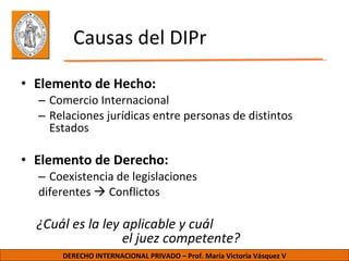 El documento presenta una introducción al concepto de derecho internacional privado. Explica que el derecho internacional privado surge para resolver conflictos en las relaciones jurídicas entre personas de distintos estados, como cuál legislación se aplica y qué tribunal es competente. También describe los diferentes enfoques y métodos del derecho internacional privado, como el método conflictual para determinar la ley aplicable, y presenta definiciones del derecho internacional privado por autores como Sánchez de Bustamante, Pillet y Caicedo Castilla.