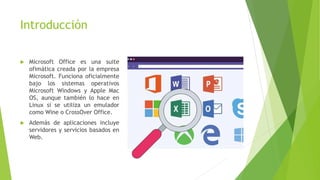 Este documento proporciona una introducción a Microsoft Office y Word. Explica que Office es una suite de aplicaciones de Microsoft que incluye Word, PowerPoint, Excel, Outlook y otros. Luego describe los componentes básicos de la interfaz de Word como la cinta de opciones, las barras de herramientas y cómo guardar, abrir y cerrar documentos. Finalmente, brinda instrucciones sobre cómo navegar en la interfaz de Word.
