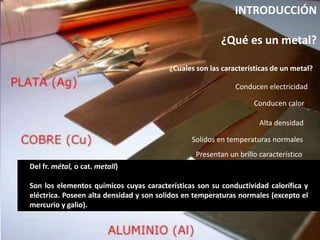 Este documento proporciona una introducción a los metales, describiendo sus características principales como la alta conductividad eléctrica y térmica, alta densidad y estado sólido a temperaturas normales. Explica que los metales forman la mayor parte de la tabla periódica y que incluyen tanto elementos puros como aleaciones. También describe el enlace metálico y cómo da como resultado estructuras compactas que permiten la conducción de calor y electricidad.