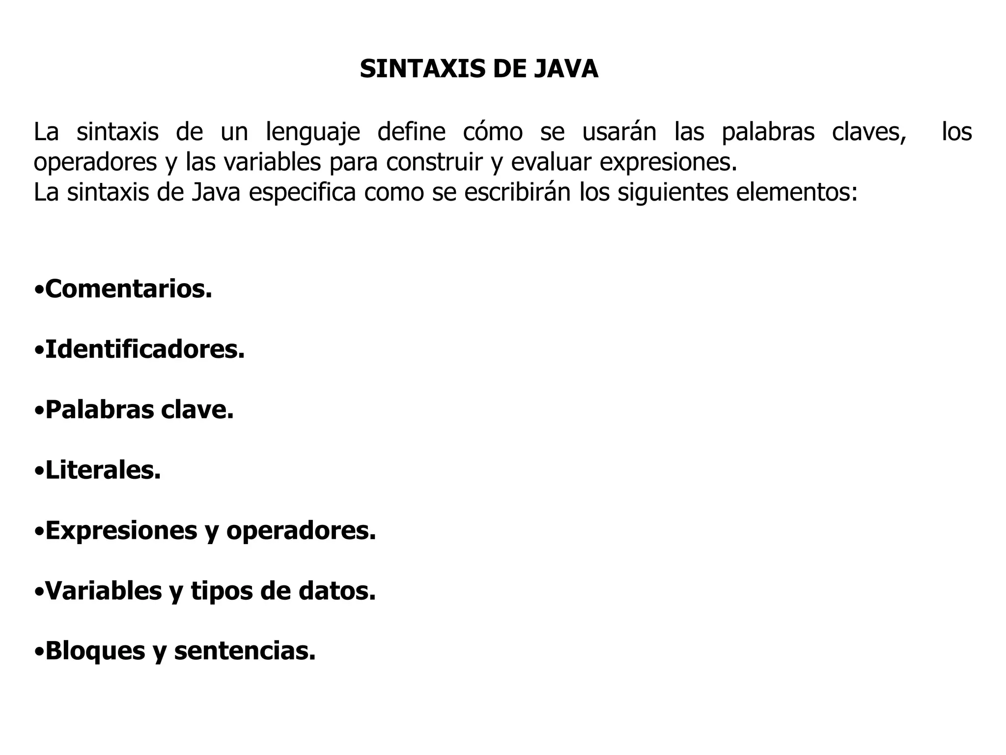 La sintaxis de Java define elementos como comentarios, identificadores, palabras clave, literales, expresiones, variables, tipos de datos, bloques de sentencias y sentencias de control de flujo. Algunos elementos clave incluyen literales para representar valores constantes, variables para almacenar datos, y sentencias como if, for y while para controlar el flujo del programa.