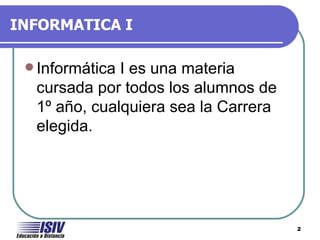 Informática I es una materia introductoria sobre el manejo básico de una computadora para todos los alumnos de primer año, la cual se estudiará de forma autodidacta con la ayuda de un profesor tutor. El curso contiene 7 módulos sobre Windows XP y el uso de archivos y carpetas, y los estudiantes deberán rendir exámenes parciales y finales para aprobar la materia.