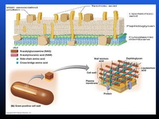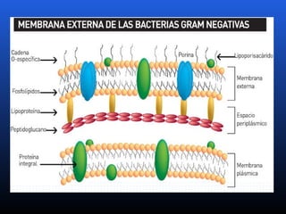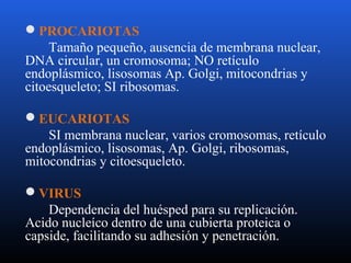 El documento trata sobre microbiología. Describe las características de procariotas y eucariotas, así como de virus. Explica la taxonomía, clasificación, nomenclatura e identificación de bacterias. Detalla la morfología, estructura y componentes de bacterias como la pared celular, membrana citoplasmática, nucleoide y otros elementos. Finalmente, presenta tablas de clasificación de bacterias gram positivas y gram negativas.