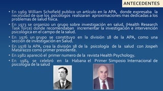 La psicología de la salud estudia la interacción entre los componentes psíquico, biológico y social y cómo estos afectan el estado general de bienestar de una persona, el cual incluye no solo la ausencia de enfermedad sino también un estado de bienestar físico, mental y social. La psicología de la salud busca aumentar el bienestar y la salud de las personas a través de la prevención y modificación de enfermedades considerando los pensamientos, sentimientos y estilo de vida de cada individuo.