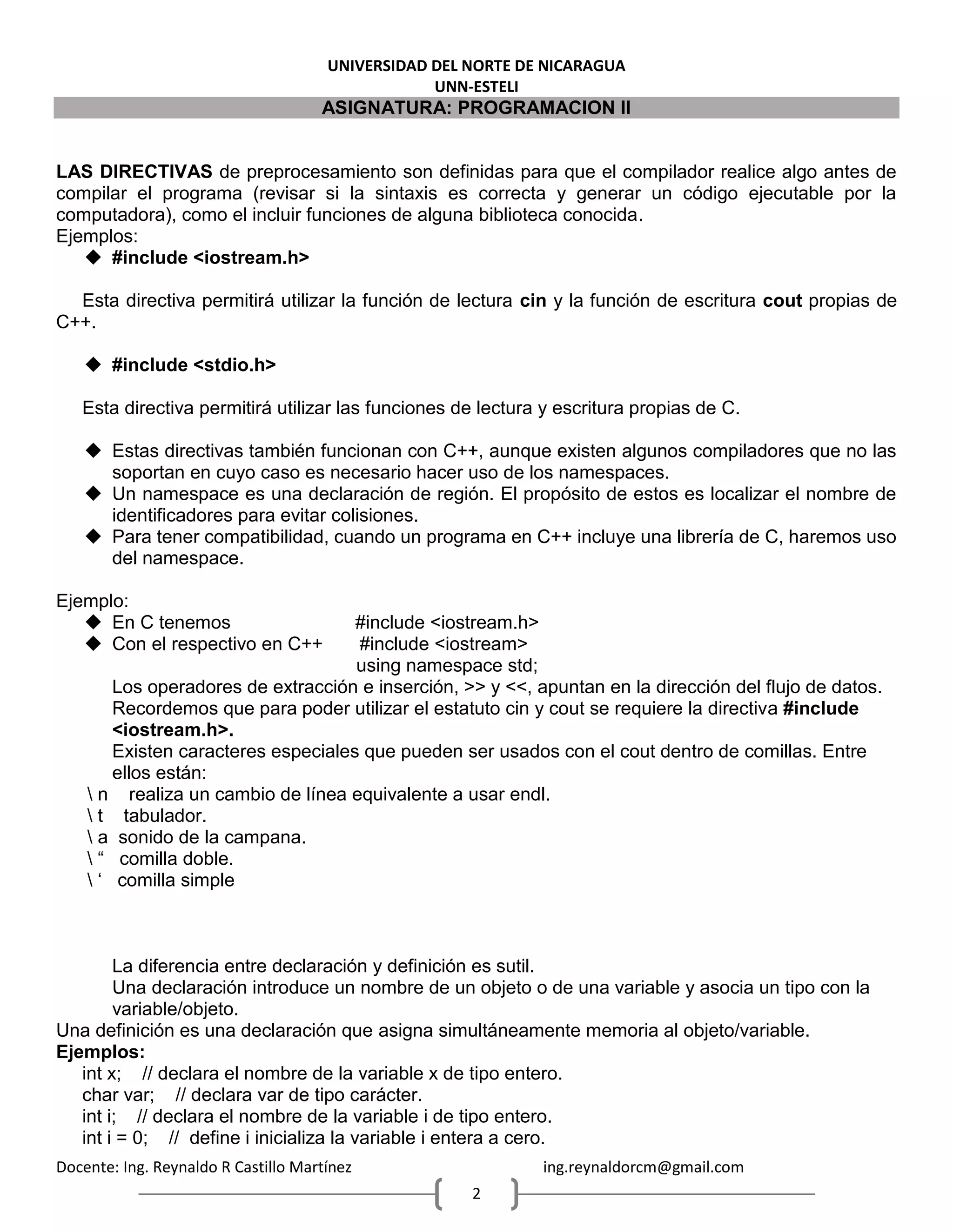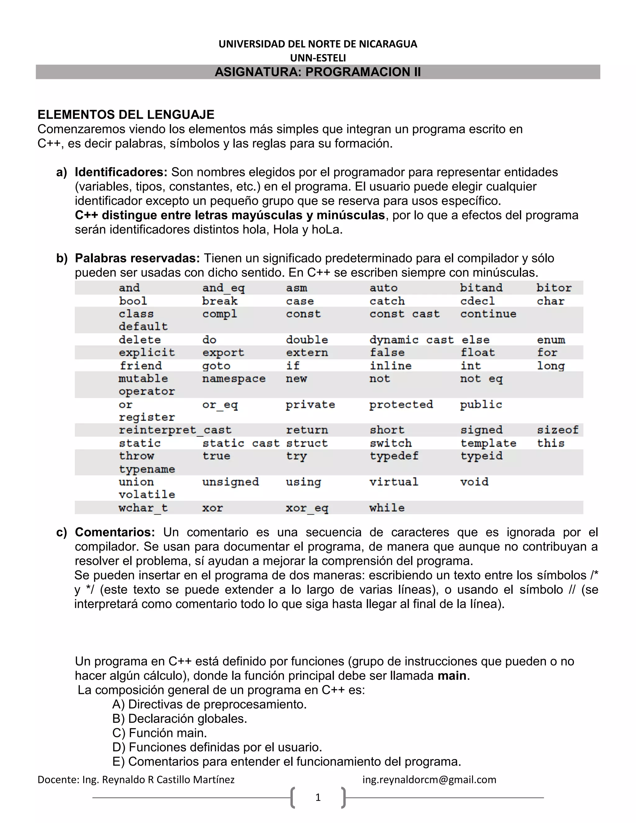 El documento describe los elementos básicos de un programa en C++, incluyendo identificadores, palabras reservadas, comentarios, funciones y la estructura general de un programa. Explica las directivas de preprocesamiento como #include para incluir bibliotecas estándar, y describe funciones básicas de entrada y salida como cin y cout. También presenta un ejemplo de código para determinar el número mayor entre tres valores ingresados.