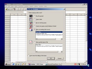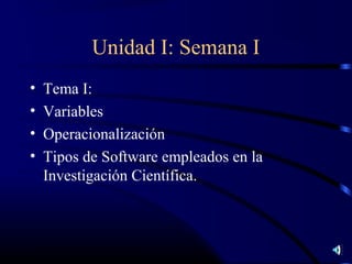 Este documento presenta un curso interactivo sobre el uso de software para la investigación en salud. Explica los tipos de variables cualitativas y cuantitativas, así como ejemplos de cada una. También describe los principales softwares estadísticos, cualitativos y de procesamiento de texto utilizados en la investigación científica, enfocándose en el uso de SPSS y EPI-INFO.