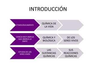 Este documento presenta una introducción a la bioquímica. Explica que la bioquímica estudia los seres vivos y las sustancias químicas y reacciones químicas involucradas. Luego describe los principales bioelementos que componen los seres vivos, incluidos los bioelementos primarios como el carbono, hidrógeno, oxígeno y nitrógeno. Finalmente, se enfoca en el agua, la molécula más abundante en los seres vivos y sus propiedades y funciones importantes como disolvente universal y ter