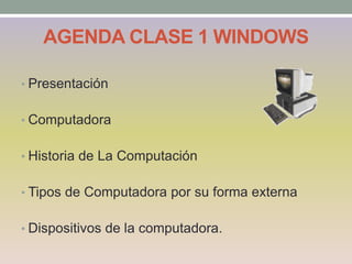 Este documento presenta una introducción al curso Técnico Operador Básico de Windows y Office. Explica que el curso dura 6 meses y se llevará a cabo los días de la semana de 10:00 a 12:00 am. La primera clase cubrirá la presentación, tipos de computadoras, dispositivos de hardware y el programa Paint. También proporciona breves resúmenes sobre la historia de la computación y conceptos técnicos básicos como software, hardware, sistemas informáticos y dispositivos de entrada, procesamiento, salida y