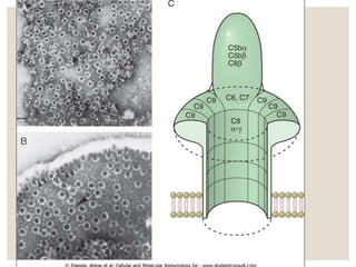 El sistema de complemento está formado por alrededor de 30 proteínas plasmáticas que se activan en cascada para opsonizar patógenos, inducir inflamación y lisiar células. Se activa a través de tres vías: la vía clásica iniciada por anticuerpos, la vía alternativa activada por la superficie de microorganismos, y la vía de las lectinas. La activación conduce a la formación del complejo de ataque de membrana que perfora las membranas de patógenos. La activación del complemento está regulada
