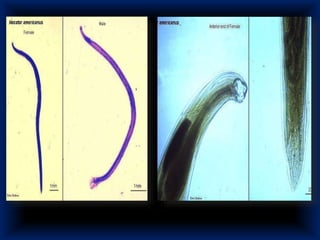 Este documento proporciona información sobre la uncinariasis, una enfermedad parasitaria causada por los anquilostomidos Ancylostoma duodenale y Necator americanus. Describe el ciclo de vida, síntomas, diagnóstico y tratamiento de estos parásitos. Se transmite por penetración activa de la piel por larvas infectivas, las cuales migran a los pulmones e intestinos donde maduran en gusanos adultos que se fijan y causan anemia por pérdida de sangre. El diagnóstico