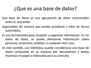 Este documento describe las bases de datos, incluyendo su definición, tipos, modelos y componentes. Una base de datos es una colección organizada de datos relacionados entre sí que pueden accederse automáticamente. Existen bases de datos estáticas y dinámicas, bibliográficas, de texto completo y directorios. Los modelos incluyen jerárquicos, de red y relacionales, que son los más comunes. Un sistema de gestión de bases de datos (SGBD) administra el acceso a los datos y mantiene la seguridad, consistencia y otros
