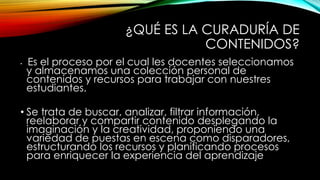 El documento describe el proceso de curaduría de contenidos por parte de los docentes, que implica seleccionar y organizar una colección de recursos y contenidos digitales para enriquecer la experiencia de aprendizaje de los estudiantes. Además, proporciona varios ejemplos de contenidos y recursos digitales relacionados con los derechos de los niños que los docentes pueden incluir en su curaduría. Finalmente, invita a los docentes a explorar la plataforma Juana Manso y a continuar trabajando en un mapa conceptual col