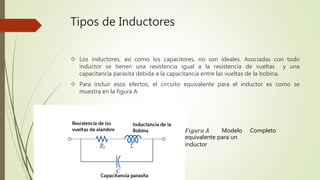 El documento describe diferentes tipos de inductores, incluyendo sus símbolos, apariencia y modelos equivalentes. También explica cómo colocar inductores en serie y paralelo para obtener niveles crecientes o decrecientes de inductancia total. Finalmente, presenta ejemplos de cálculos de corriente e inductancia para circuitos que contienen inductores.