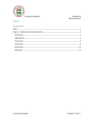 Este documento describe los pasos para combinar una base de datos en Excel con un documento de Word utilizando la función de combinación de correspondencia. Explica los 6 pasos principales: 1) seleccionar la base de datos en Excel, 2) agregar los campos de datos, 3) ver los primeros datos combinados, 4) seleccionar imprimir o editar cartas individuales, 5) filtrar la lista de destinatarios, y 6) imprimir las cartas combinadas. El objetivo es utilizar la información en Excel para personalizar automáticamente cartas en Word.
