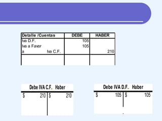 Este documento resume conceptos básicos sobre el Impuesto al Valor Agregado (IVA) en Argentina. Explica que la alícuota general del IVA es del 21% y cubre el consumo doméstico y las importaciones. También describe las exenciones de algunos productos y servicios, así como los problemas que genera el IVA como la evasión y su impacto distributivo. Define los sujetos activos y pasivos del IVA y las diferentes categorías de responsables como inscriptos, no inscriptos y monotributistas. Finalmente, da un ejemplo sobre cómo se contabiliz