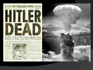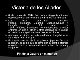 Las tropas aliadas derrotaron a Alemania en Europa. En junio de 1944, las tropas angloamericanas desembarcaron en Normandía y liberaron Francia, mientras que los soviéticos avanzaron ocupando Europa del Este. Alemania se rindió incondicionalmente en mayo de 1945. En septiembre del mismo año, Japón también se rindió luego de que Estados Unidos lanzara bombas atómicas sobre Hiroshima y Nagasaki.