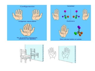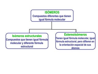 El documento describe diferentes tipos de isómeros, incluyendo isómeros estructurales, estereoisómeros, isómeros configuracionales, isómeros conformacionales, enantiómeros, y diastereómeros. Los estereoisómeros son compuestos que tienen la misma fórmula molecular y estructural pero difieren en la orientación espacial de sus átomos. Los enantiómeros son estereoisómeros que son imágenes especulares no superponibles, mientras que los diastereómeros no son imágenes