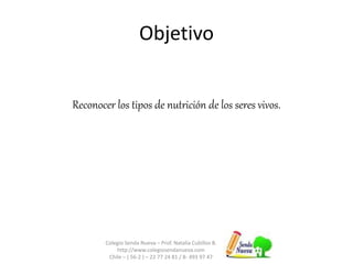 El documento describe los diferentes tipos de nutrición en los seres vivos. Explica que la nutrición es el proceso biológico mediante el cual los organismos asimilan y utilizan alimentos y líquidos para su funcionamiento, crecimiento y mantenimiento. Los seres vivos se clasifican en productores, como los organismos fotosintéticos y quimiosintéticos, y consumidores, como herbívoros, carnívoros y omnívoros. También habla sobre los descomponedores y sus funciones.