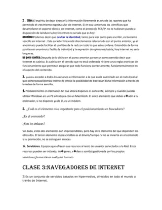 1. Internet es un conjunto descentralizado de redes interconectadas que usan protocolos TCP/IP para funcionar como una red lógica global. 2. Los navegadores web como Netscape y Explorer permiten visualizar páginas web accediendo al protocolo HTTP. 3. Los buscadores como Google y Yahoo permiten realizar búsquedas en la web introduciendo palabras clave.