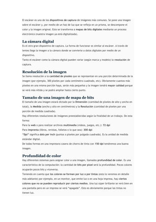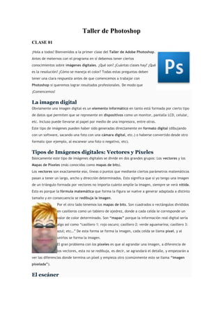 Este documento presenta una introducción a los conceptos básicos de las imágenes digitales. Explica que existen dos tipos principales de imágenes - vectores y mapas de píxeles - y describe las características de cada uno. También cubre temas como la resolución, los formatos de archivo de imagen comunes como JPEG, PNG y TIFF, y los sistemas de color como RGB y CMYK. El objetivo es proporcionar una comprensión fundamental de estas nociones clave antes de comenzar a trabajar directamente con el software de edición de imágenes Phot
