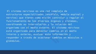 El documento resume las principales características del sistema nervioso. Explica que está compuesto por el encéfalo, médula espinal y nervios, y tiene las funciones sensitiva, integradora y motora. Se clasifica según su anatomía en central y periférico, y según su función en somático y autónomo. Describe la estructura y funciones de la médula espinal y los nervios espinales.