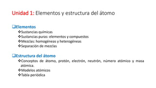 Este documento presenta información sobre la unidad 1 de Química que cubre los temas de elementos, estructura del átomo, y la tabla periódica. Explica conceptos clave como átomo, protón, electrón, neutrón, y sus características. También describe los modelos atómicos históricos y la organización y características de la tabla periódica.