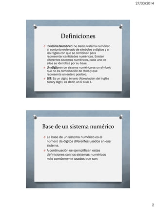 Este documento presenta información sobre los sistemas de numeración binario y decimal. Explica las definiciones de bit, byte y nibble y cómo convertir números entre los sistemas binario y decimal. También describe el significado y valores de los nibbles en el sistema hexadecimal.
