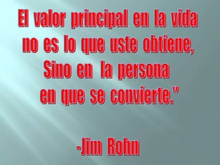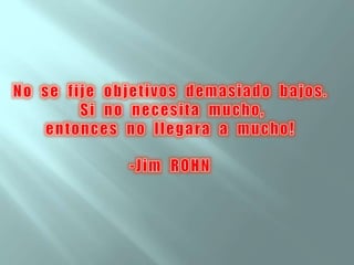 El documento habla sobre cinco cosas que afectan a una persona: 1) el ambiente, 2) los eventos experimentados, 3) la sabiduría recolectada, 4) la actitud positiva o negativa, y 5) los sueños y visión para el futuro. También discute herramientas para mejorar la autoestima, visualización, y tomar acción para lograr metas.