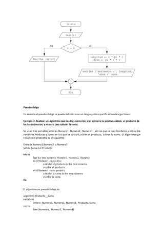 Este documento describe los pasos para resolver un problema utilizando algoritmos, incluyendo el diseño del algoritmo, la codificación del programa y la ejecución para validar la solución. Explica que los algoritmos son secuencias ordenadas de pasos para resolver un problema y que herramientas como diagramas de flujo y pseudocódigo se usan comúnmente para diseñarlos. También incluye ejemplos de algoritmos para calcular el área y perímetro de un círculo y determinar si se calcula la suma o el producto de tres números.