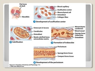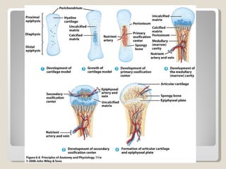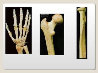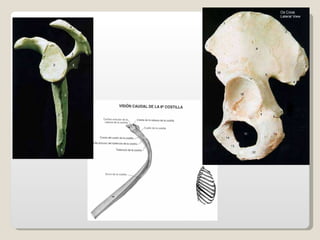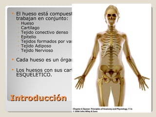 El documento proporciona una introducción general al sistema esquelético, incluyendo sus principales funciones, componentes celulares y tejidos, así como su histología, formación, crecimiento y clasificación. Explica que el sistema esquelético está compuesto de huesos y cartílagos que cumplen funciones de soporte, protección y movimiento. Describe los diferentes tipos de huesos, tejidos óseos, procesos de osificación, marcas en la superficie de los huesos y su irrigación sanguínea.