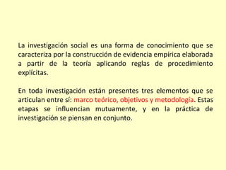 Este documento describe las etapas del proceso de investigación, incluyendo el marco teórico, los objetivos, y la metodología. Explica que estos tres elementos se influyen mutuamente y deben pensarse de forma conjunta. Además, detalla las etapas de la investigación como la preparatoria, preliminar y principal.