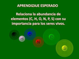 Este documento describe los principales elementos químicos que componen el cuerpo humano, clasificándolos en primarios, secundarios y oligoelementos. Los primarios como el carbono, oxígeno, hidrógeno y nitrógeno constituyen aproximadamente el 96% de la masa total y son esenciales para formar biomoléculas. Los secundarios como el calcio, sodio y magnesio también son importantes aunque en menor proporción. Finalmente, los oligoelementos como el hierro, yodo y zinc cumplen funciones vitales a
