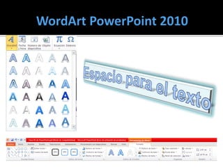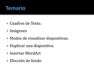 El documento proporciona instrucciones sobre cómo usar varias funciones en PowerPoint, incluyendo la inserción de cuadros de texto, imágenes, la duplicación de diapositivas, y la selección de fondos. Explica cómo agregar formatos a los cuadros de texto y cómo insertar imágenes desde la biblioteca prediseñada, archivos o sitios web. También describe las diferentes vistas de diapositivas y cómo agregar WordArt y cambiar los temas.