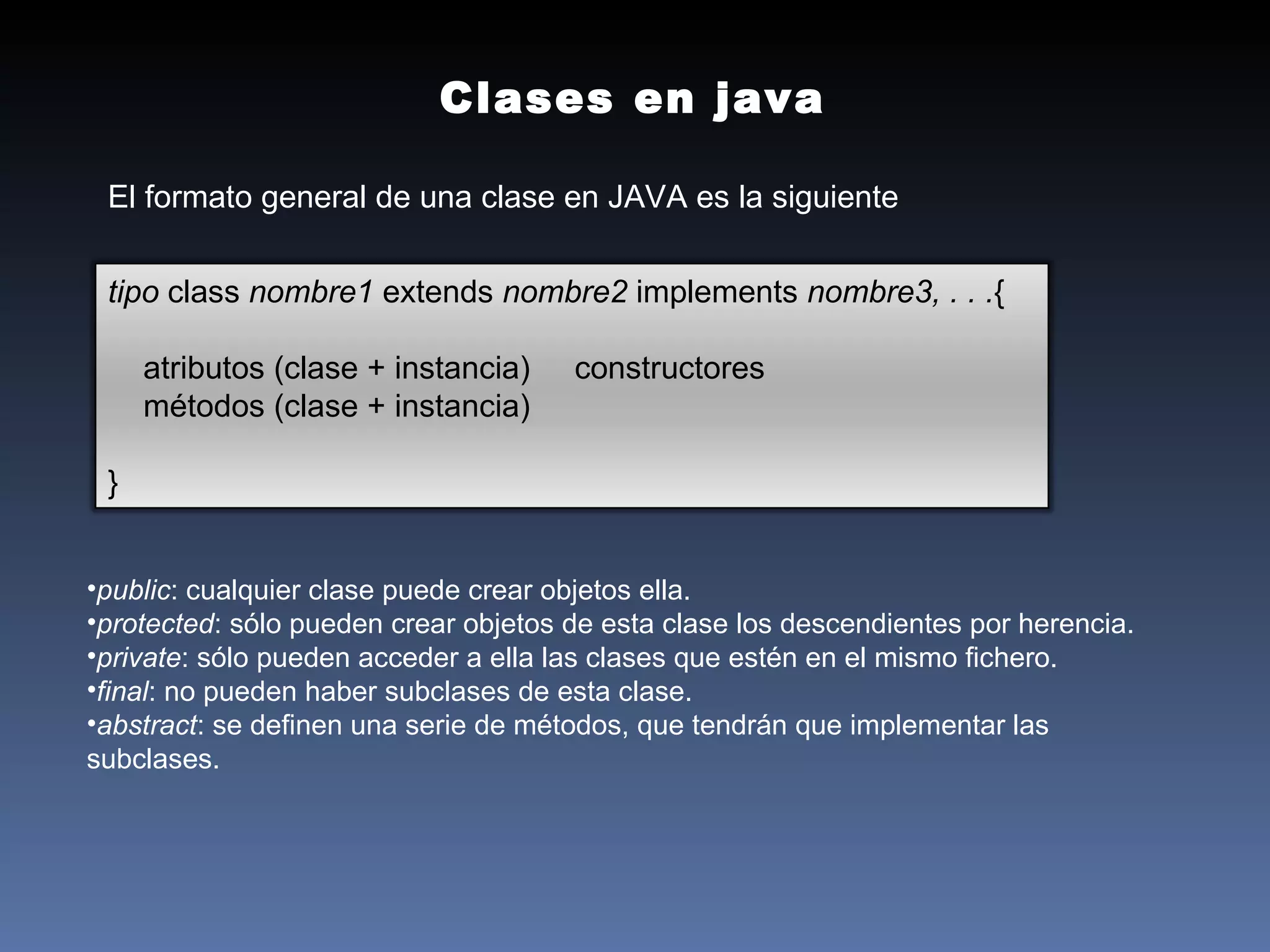 El documento describe las características básicas de las clases, atributos, métodos y constructores en Java. Explica que las clases pueden ser públicas, protegidas o privadas y pueden heredar de otras clases. Los atributos y métodos también pueden ser públicos, protegidos, privados, estáticos o finales. También cubre las estructuras condicionales if-else y switch, así como los bucles while, do-while y for.