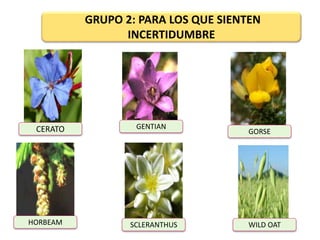 Este documento presenta información sobre diferentes terapias florales de Bach para tratar emociones como la incertidumbre, la falta de confianza, la desesperanza, la fatiga mental, la indecisión, la falta de interés por el presente y la resignación. Describe cada terapia floral, incluidos sus aspectos negativos y positivos. El documento también proporciona instrucciones para preparar una esencia floral personalizada basada en la evaluación emocional del paciente.