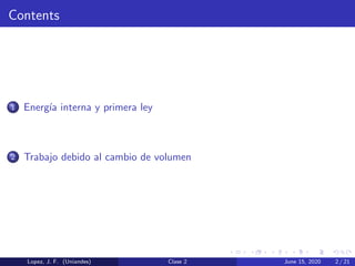 Este documento presenta la primera ley de la termodinámica y diferentes procesos termodinámicos. Explica conceptos como la energía interna de un sistema, el trabajo realizado por un cambio de volumen, y la relación entre el cambio de energía interna, el calor transferido y el trabajo. También describe procesos como isocórico, isobárico e isotérmico, y aplica los conceptos a un ejemplo numérico.