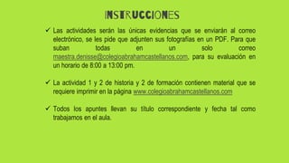 Este documento contiene instrucciones para actividades escolares de varias materias como español, matemáticas, historia y formación cívica y ética. Se pide a los estudiantes completar actividades en libros de texto y en línea, y enviar las fotografías de las actividades completadas antes del viernes 5 de junio a una dirección de correo electrónico especificada. Algunas actividades requieren imprimir materiales de una página web dada.