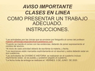 Este documento proporciona instrucciones para estudiantes sobre cómo presentar trabajos de manera adecuada para las clases en línea de civismo del 5o grado los días 3 y 4 de junio. Instruye a los estudiantes a enviar las actividades por correo electrónico al maestro, incluyendo su nombre, la materia y fecha. También indica que deben escribir resúmenes en sus cuadernos y realizar actividades de civismo e historia en el cuaderno o imprimiéndolas. El viernes 5 de junio es