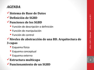 El documento habla sobre los sistemas de base de datos. Explica que un sistema gestor de base de datos (SGBD) permite a los usuarios acceder y manipular los datos almacenados en la base de datos de forma controlada. También describe las tres capas de abstracción de una base de datos y las funciones principales de un SGBD, incluyendo la descripción, manipulación y control de datos.