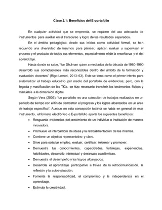 El documento describe los beneficios del uso del e-portafolio en la enseñanza. Explica que el e-portafolio permite resguardar evidencias del aprendizaje de manera innovadora, promueve el intercambio de ideas y la retroalimentación, y demuestra conocimientos y logros de una manera que también fomenta la responsabilidad y el compromiso con el aprendizaje. Sin embargo, advierte que el e-portafolio no debe usarse sólo para propósitos burocráticos o de evaluación, sino para compartir experiencias del