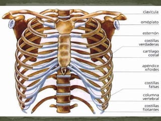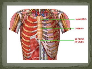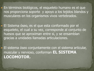 El documento describe los principales huesos y estructuras del esqueleto humano. Explica que el esqueleto está formado por 206 huesos que se clasifican en esqueleto axial y esqueleto apendicular. Describe los huesos del cráneo, la columna vertebral, el tórax, la pelvis y las extremidades. Resalta que los huesos se unen a través de articulaciones y ligamentos para permitir el movimiento.